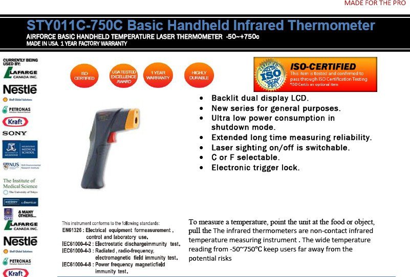 To measure a temperature, point the unit at the food or object, pull the The infrared thermometers are non-contact infrared temperature measuring instrument . The wide temperature reading from -50~750℃ keep users far away from the potential risks