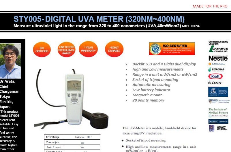 These instruments are designed to measure ultraviolet light in the range from 220 to 275 nanometers (UVC), 380 to 320 nanometers (UVA) and 280 to 400 nanometers (UVAB). The good illumination range of each kind of meter allow users to conduct the most precise quantitative measurements of ultraviolet radiation.
